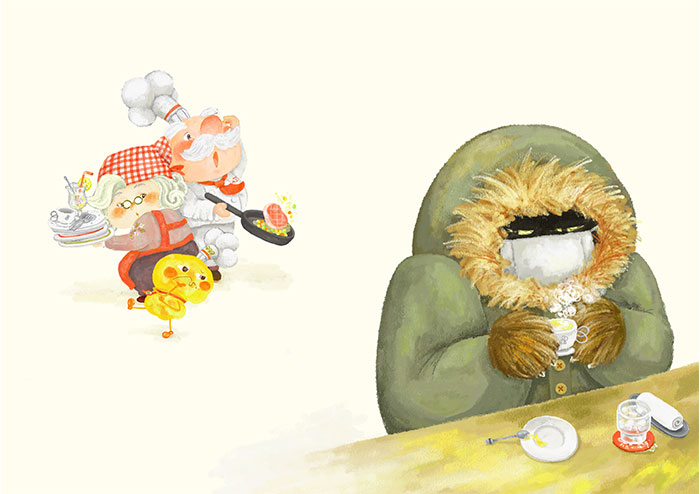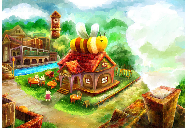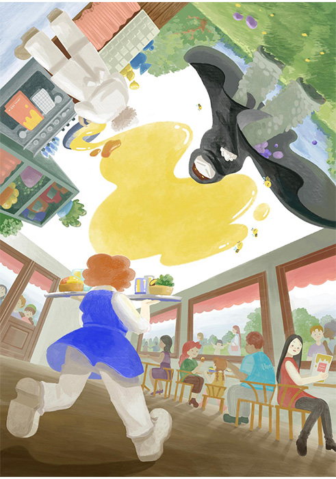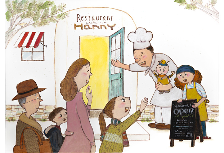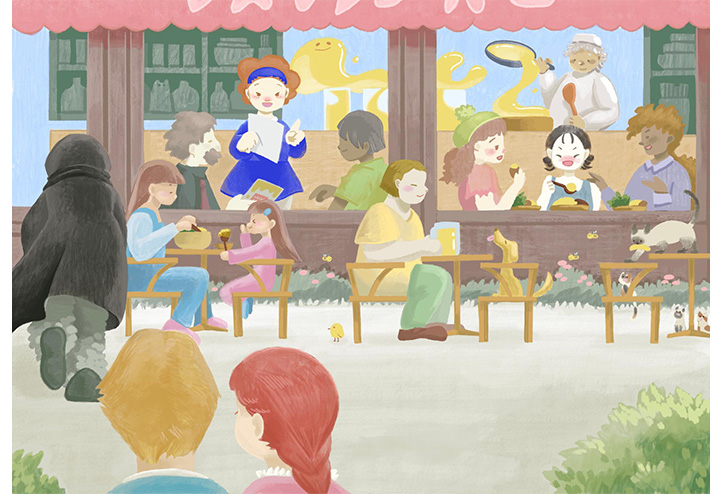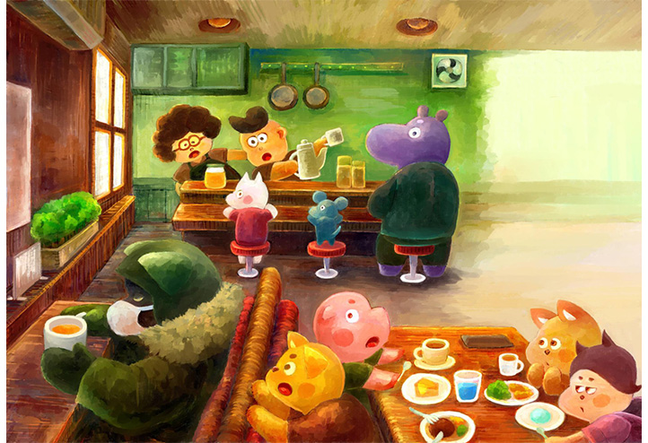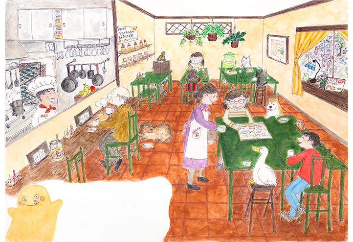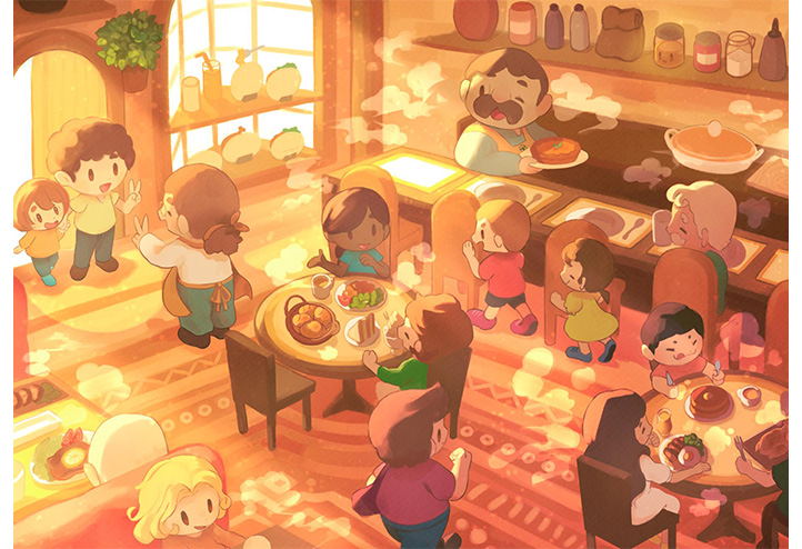 【作品講評】表情の付け方やキャラクター造形などはアニメ感が強いですが、温かみのある色使いや、ほんわかとした平和な雰囲気が素敵です。特にレストランの場面からは、地元の人に好かれているお店だということが伝わってきます。