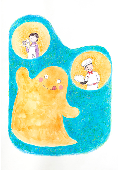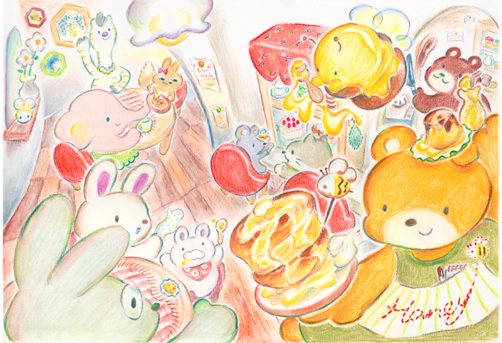 【作品講評】色鉛筆で丁寧に描かれていて、色づかいにも温かみがあり、楽しげな印象を受けます。全体を通してキャラクターの表情の付け方が少し類型的である点は惜しまれますが、とろりとして美味しそうな888の描写は可愛いらしいです。