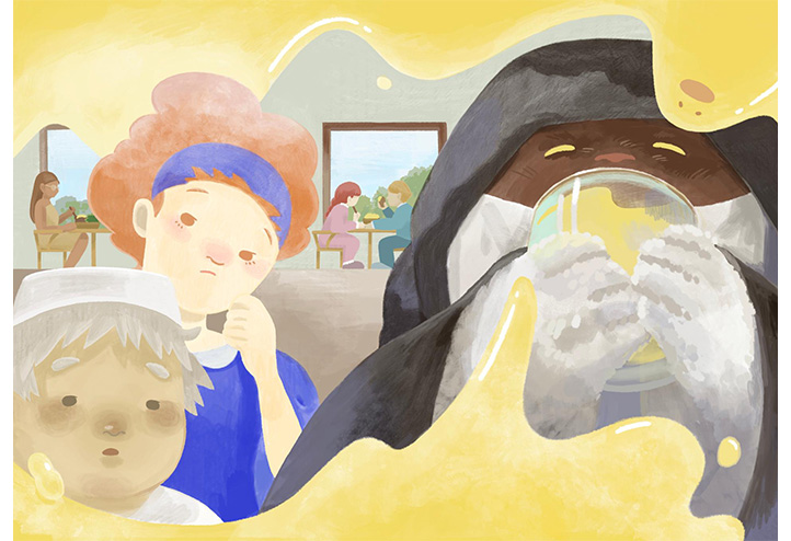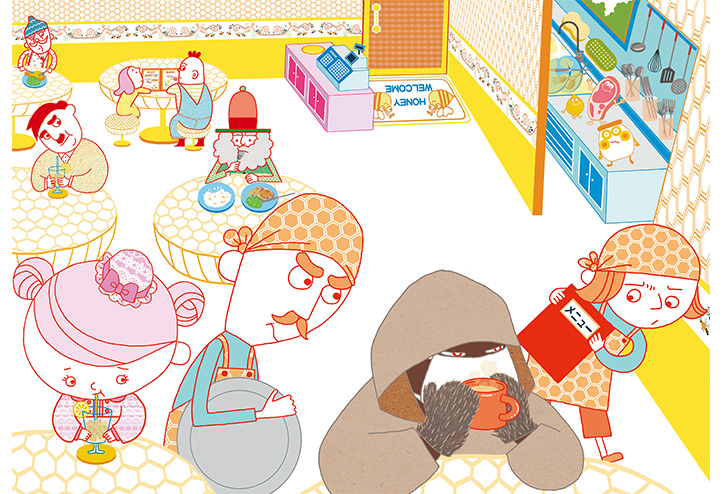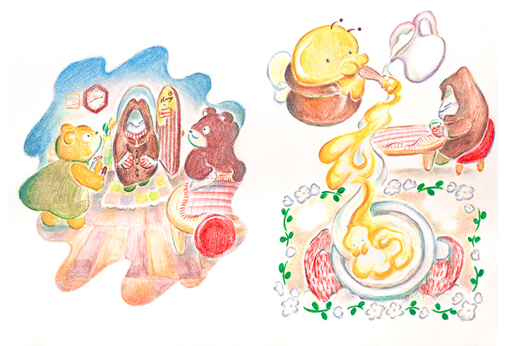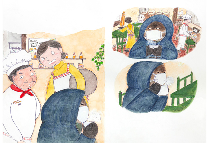 【作品講評】表紙の構図が凝っていて面白いのですが、人物の表情が見えないのは残念でした。3場面目のお客さんからは、はちみつホットミルクをおいしそうに飲んでいる様子が伝わってきます。落ち着いたトーンの色彩がきれいな作品です。
