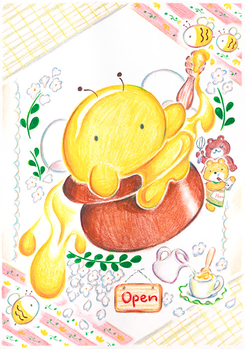 【受賞コメント】この度は栄誉ある賞をいただき、誠にありがとうございます。受賞のご連絡をいただいた際は、信じられないながらも応募してよかったと、とても嬉しい気持ちになりました。作品製作では、テーマから外れないよう、レストランでのハチミツのある暮らしをイメージしながら手を動かしました。参考情報を調べるなかで、自分の知らないハチミツの世界を、たくさん知ることができました。本コンテストを通じて、今後もぜひ活動を続けていければと思います。
