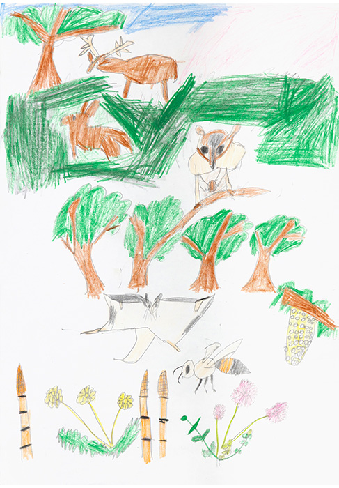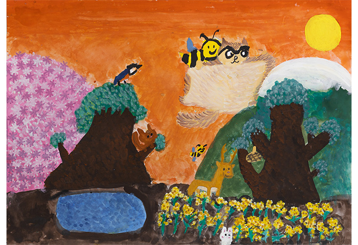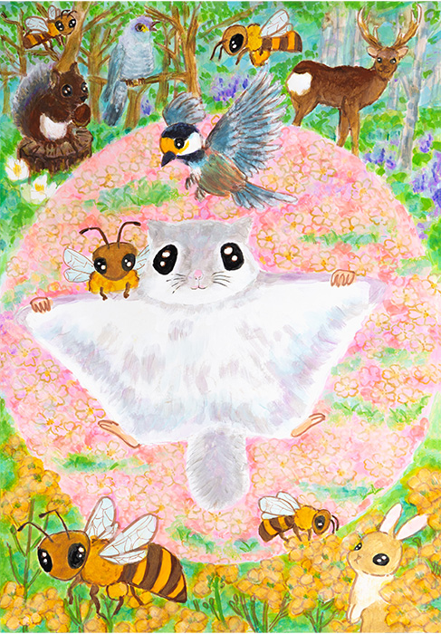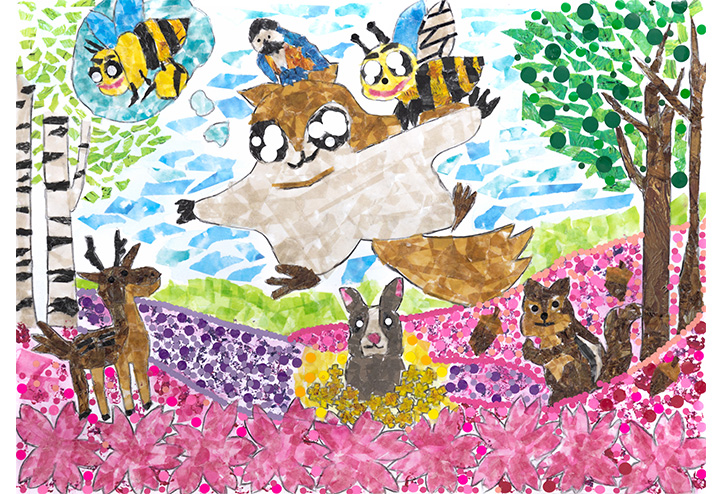 【作品講評】モモンガの背にのってミツバチが森をとぶ様子が楽しそうです。最後にひみつが明らかになる展開が面白く、終わり方にも好感がもてました。読んでいると「自分も、知らないところで誰かの役に立っているかもしれない」と思えて元気になれる、温かいお話でした。