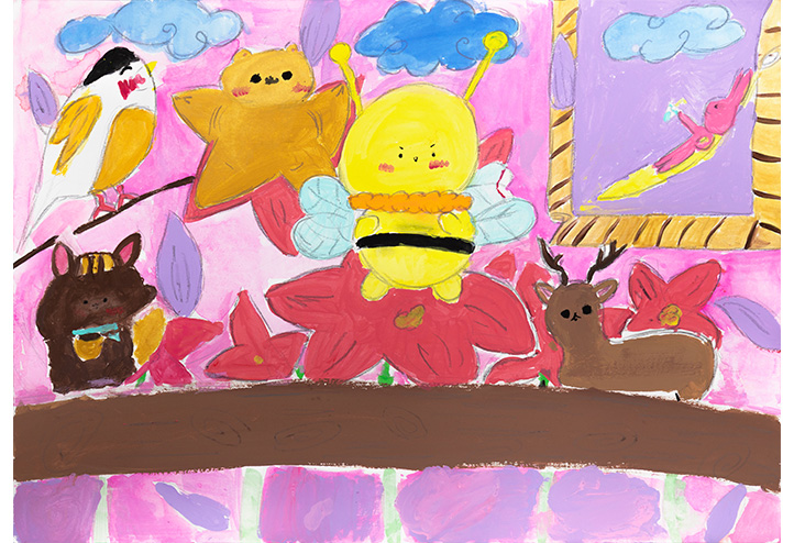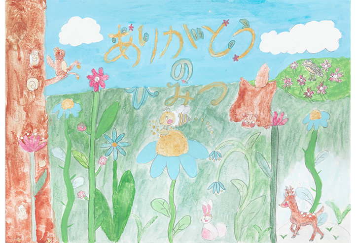 【受賞コメント】応募したきっかけは母がコンクールの紙を見せてくれたからです。妹と母といっしょにやりました。お話作りは幼稚園のころからやっていましたが、ミツバチのお話作りは初めてでした。歌が好きなので合唱隊にしました。もう4年生なので特別な要素を入れたり、ドキドキするシーンを入れたり工夫しました。受賞のお知らせが来たときはとてもうれしかったです。初めてで賞がとれたことは一番の思い出にして、来年もお話作りをします。